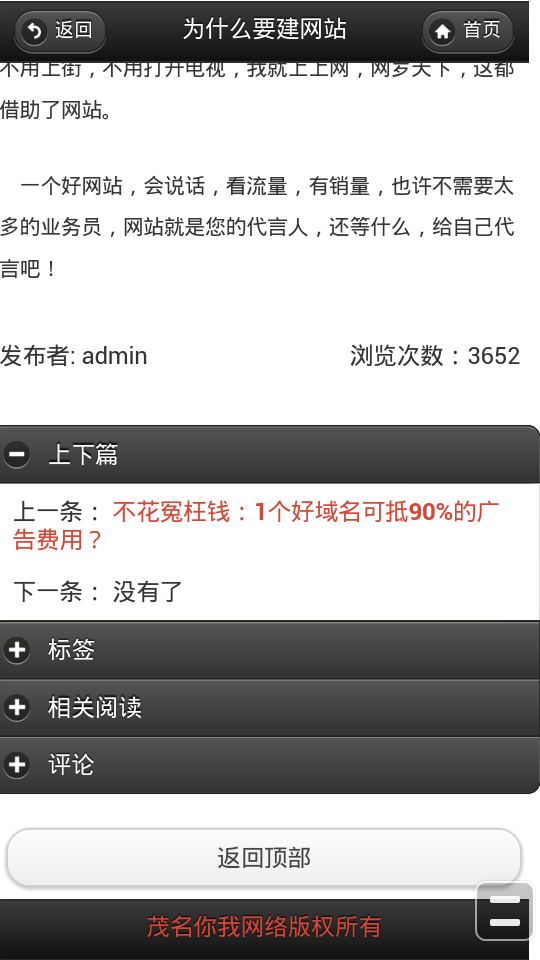 茂名你我網(wǎng)絡手機網(wǎng)站上線了,同樣的域名,不一樣的用戶體驗,讓終端客戶體驗不一樣的視覺效果。手機網(wǎng)站是適合在安卓系統(tǒng)、IOS系統(tǒng)等的移動終端上,能夠適合不同型號的手機和PAD上瀏覽的網(wǎng)站,打開網(wǎng)站的時候?qū)⒅悄茏R別終端并轉(zhuǎn)到相應的模式。它更擁有與APP軟件所沒有的功能,APP是一個系統(tǒng)應用,比如常用的手機QQ、微信等軟件,其要安裝手機上面才能直接打開,但手機網(wǎng)站只需要在手機瀏覽器里面輸入網(wǎng)址或者掃描二維碼就能打開,彰顯一樣的功能,體驗不一樣的便捷!