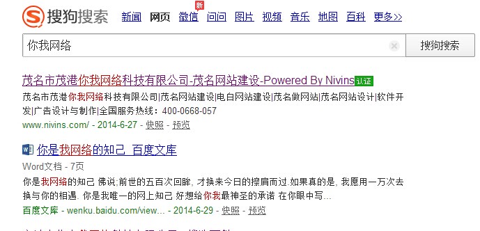你我網(wǎng)絡(luò)公司通過搜狗官網(wǎng)認(rèn)證